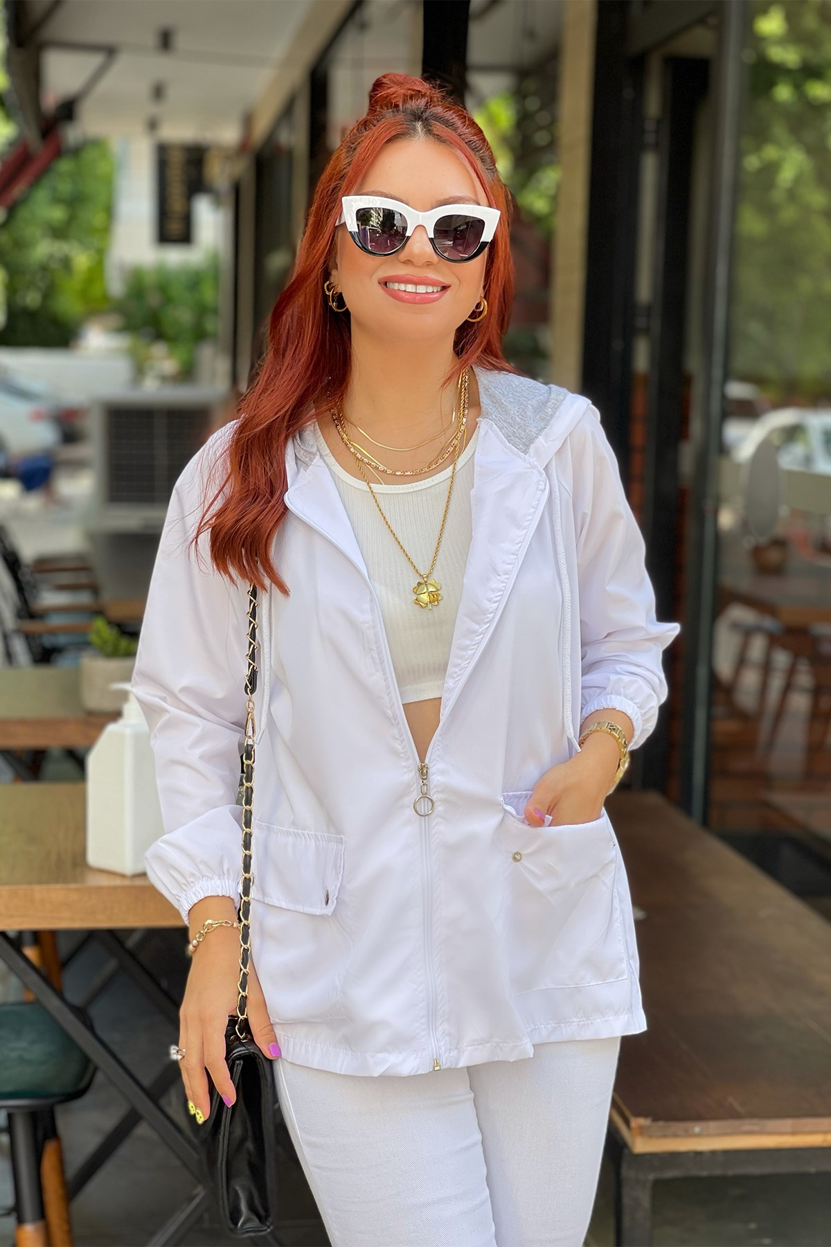 Kapşonlu Beyaz Fermuarlı Yağmurluk