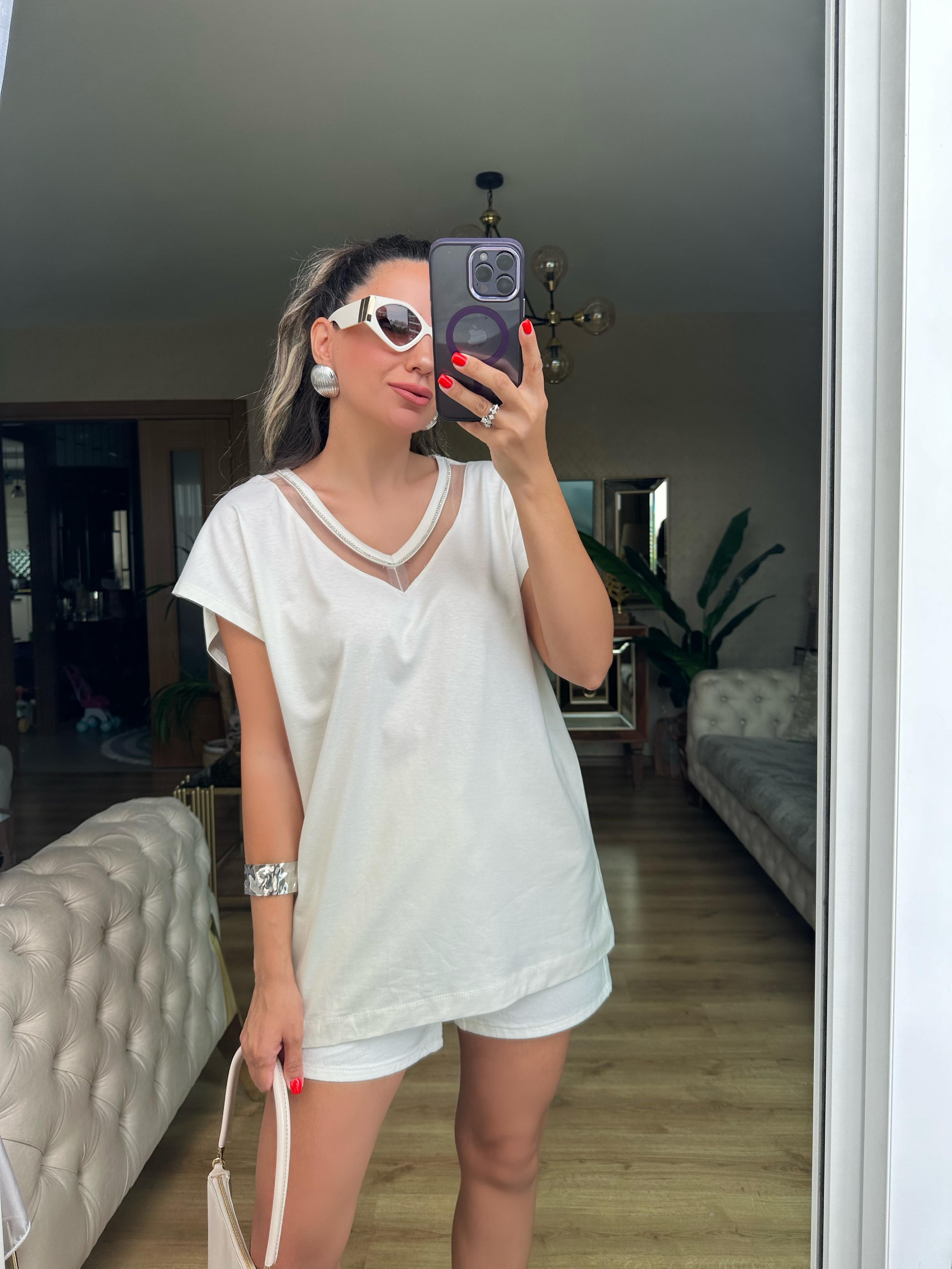 8347 Bej Taşlı V Yaka Bluz