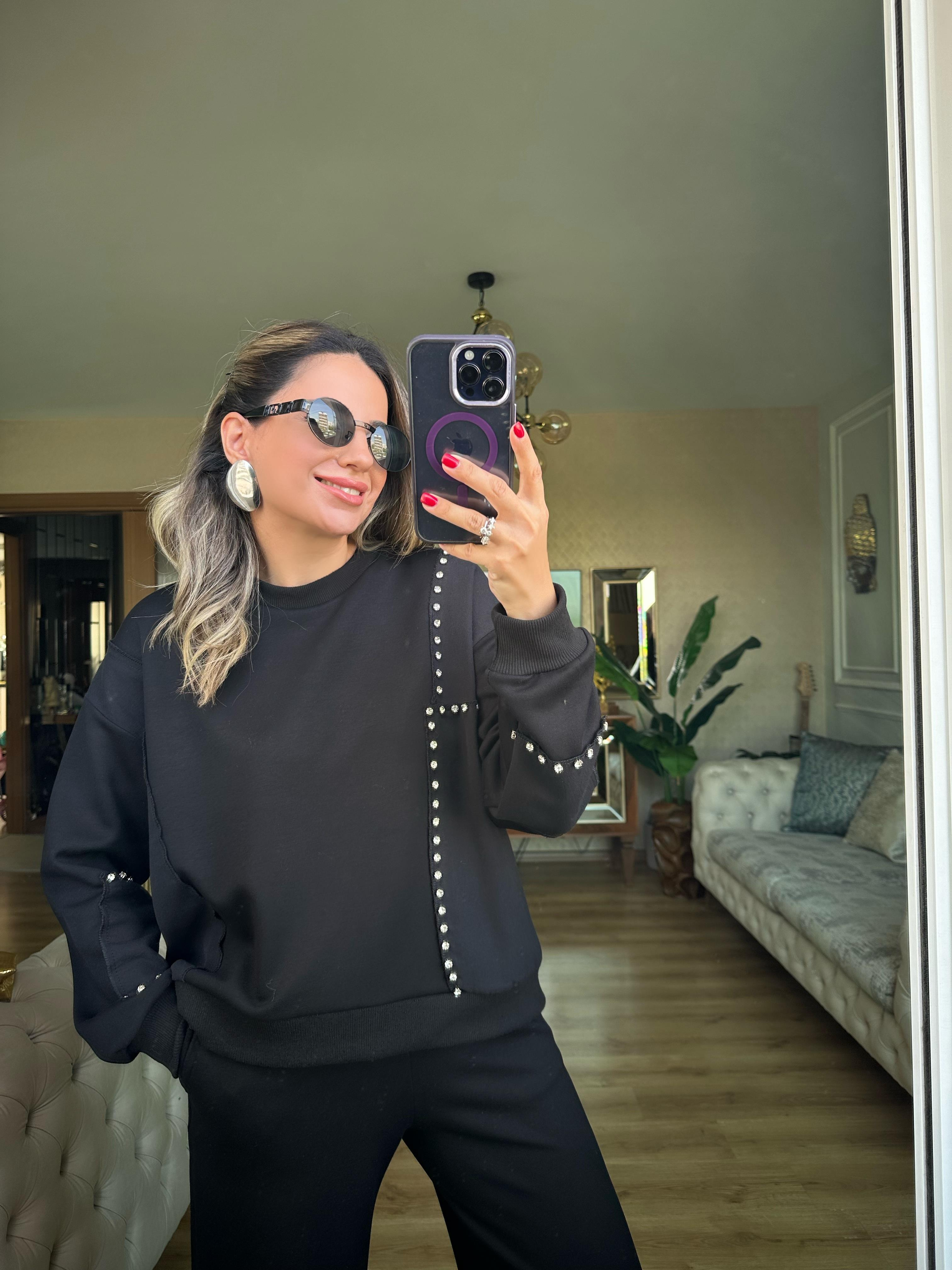 8723 Siyah Kol İşlemeli Sweatshirt (5Y20099002)