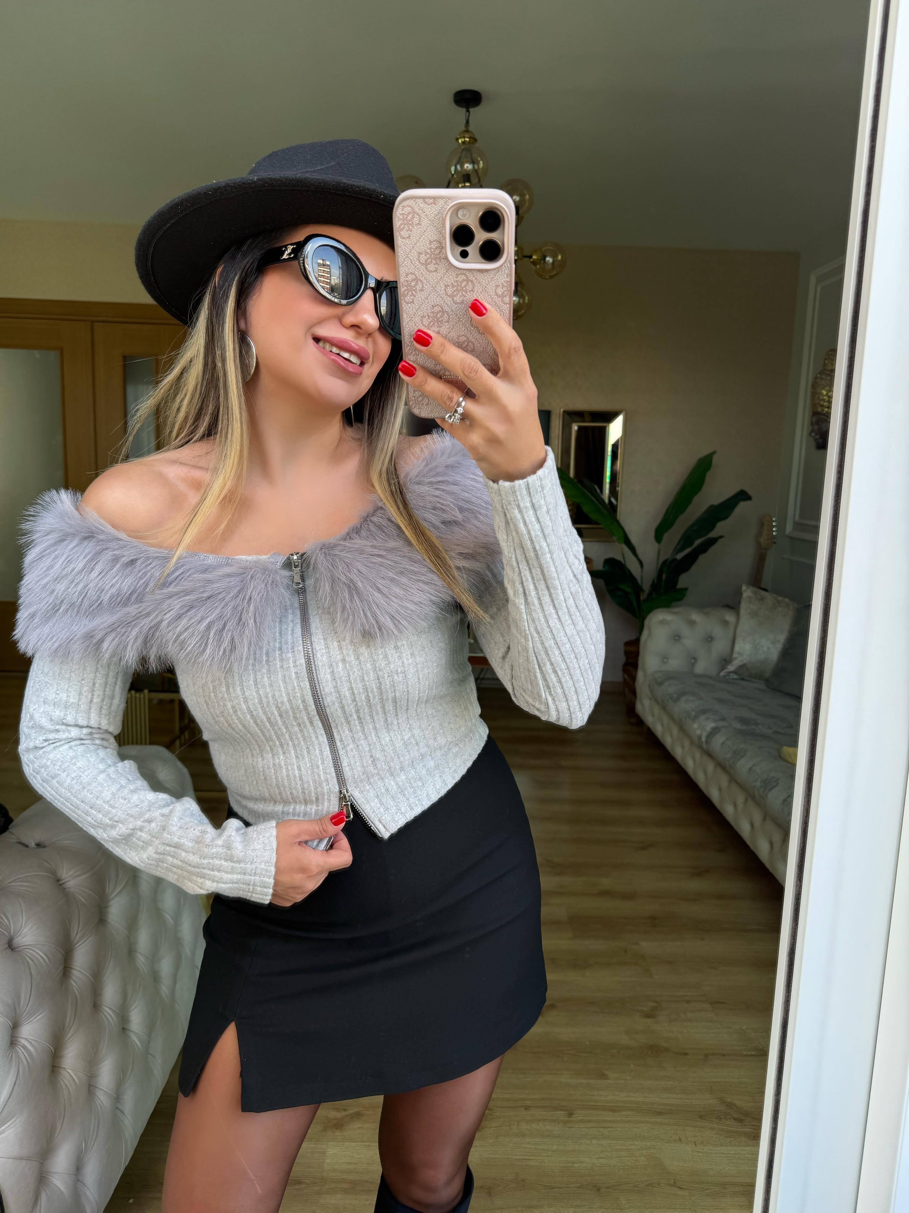 9057 Kayık Yaka Kürk Detaylı Fitilli Bluz