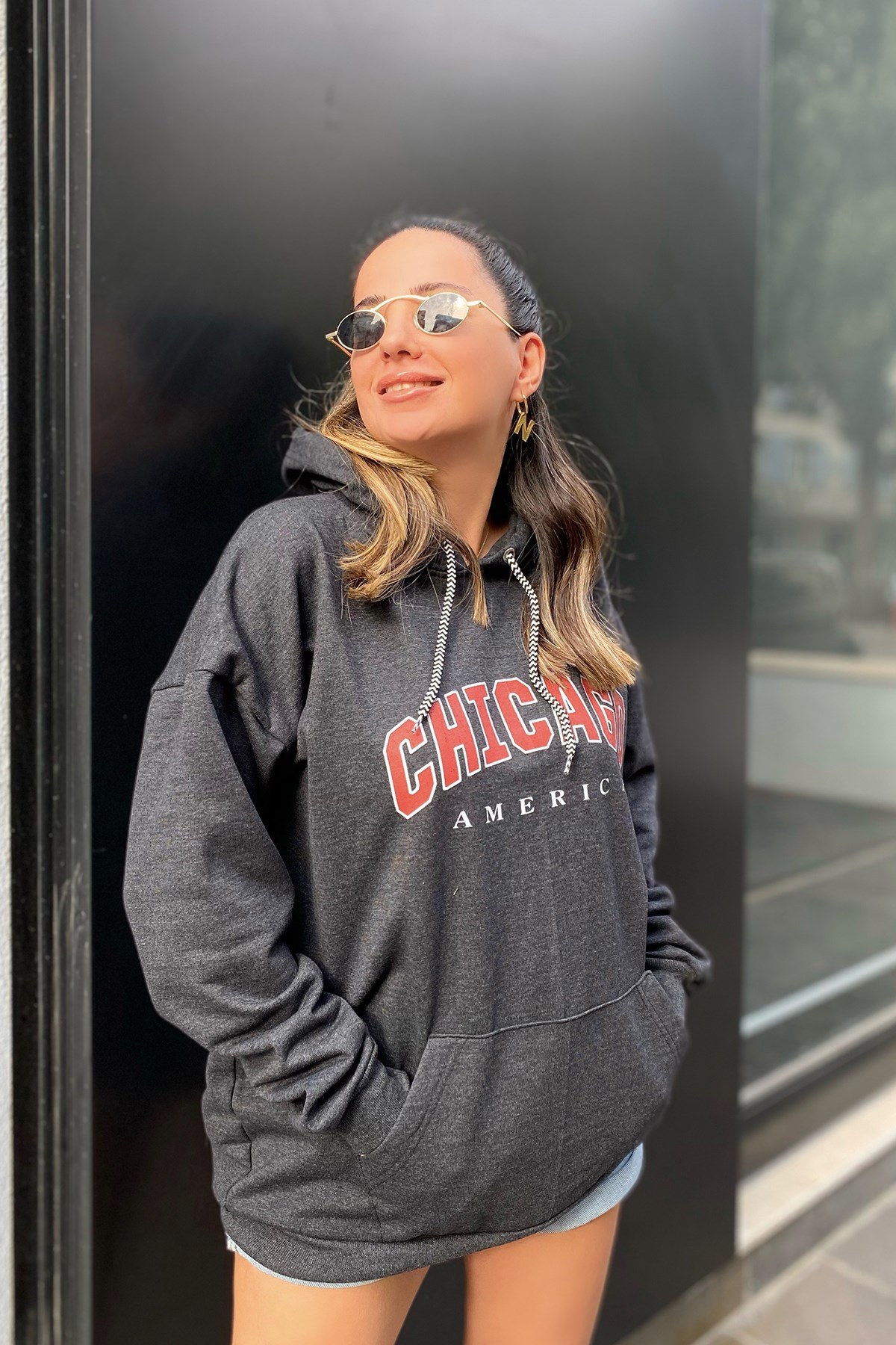Antrasit Yazı Baskılı Kapşonlu Sweatshirt