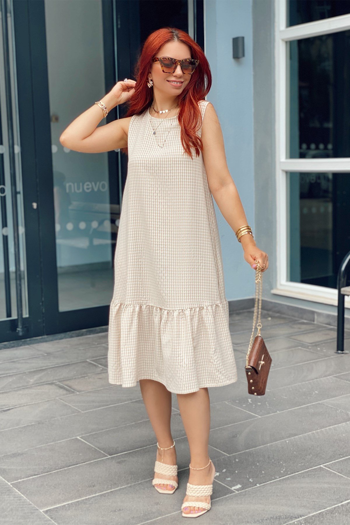 Bej Kareli Sıfır Kol Volanlı Elbise