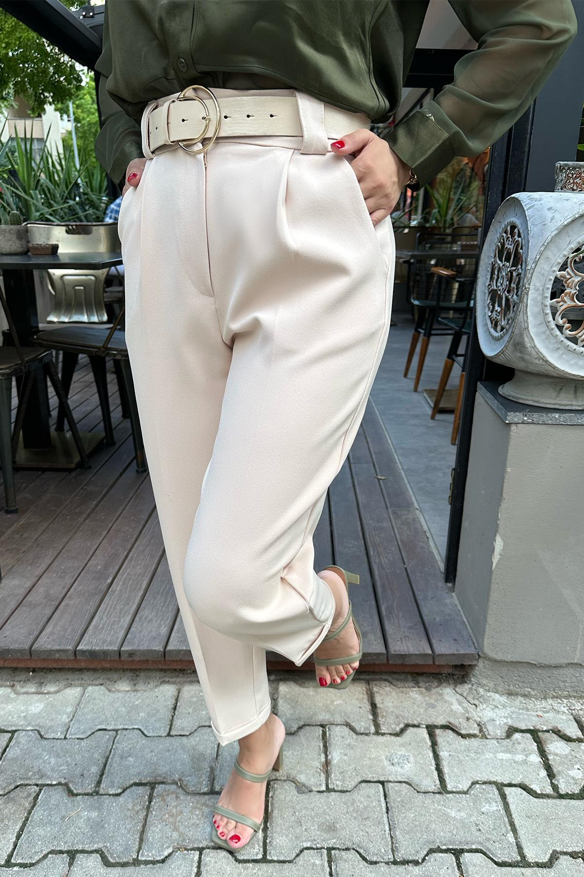 Duble Paça Taş Renk Kendinden Kemerli Kumaş Pantolon