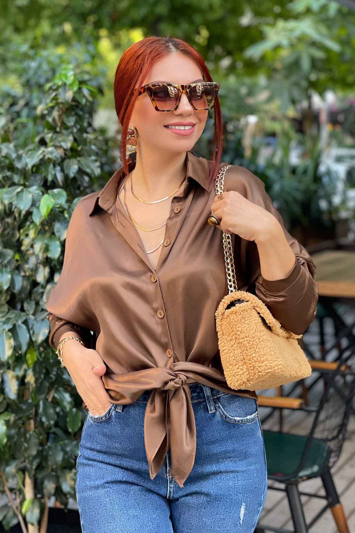 Düşük Omuz Saten Kahve Oversize Gömlek