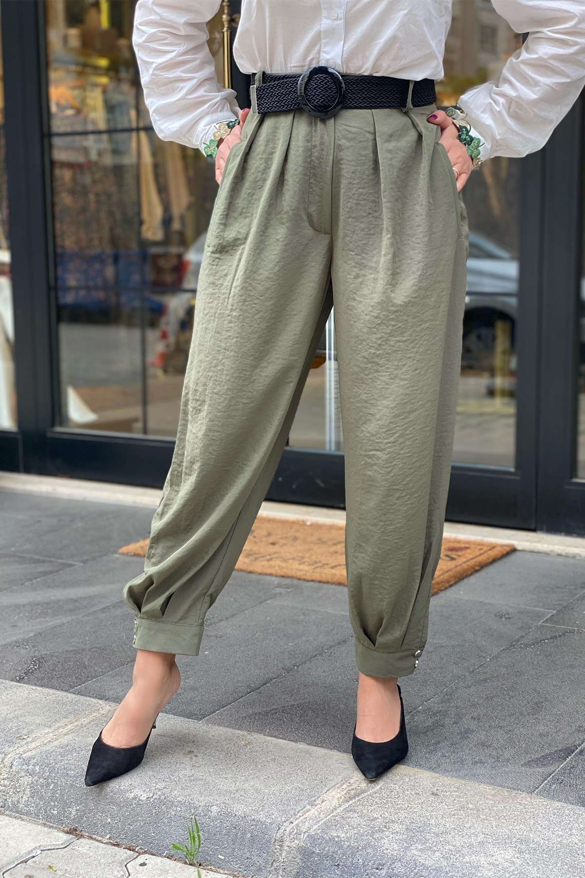 Haki Kemerli Paçası Çıtçıt Detaylı Pantolon