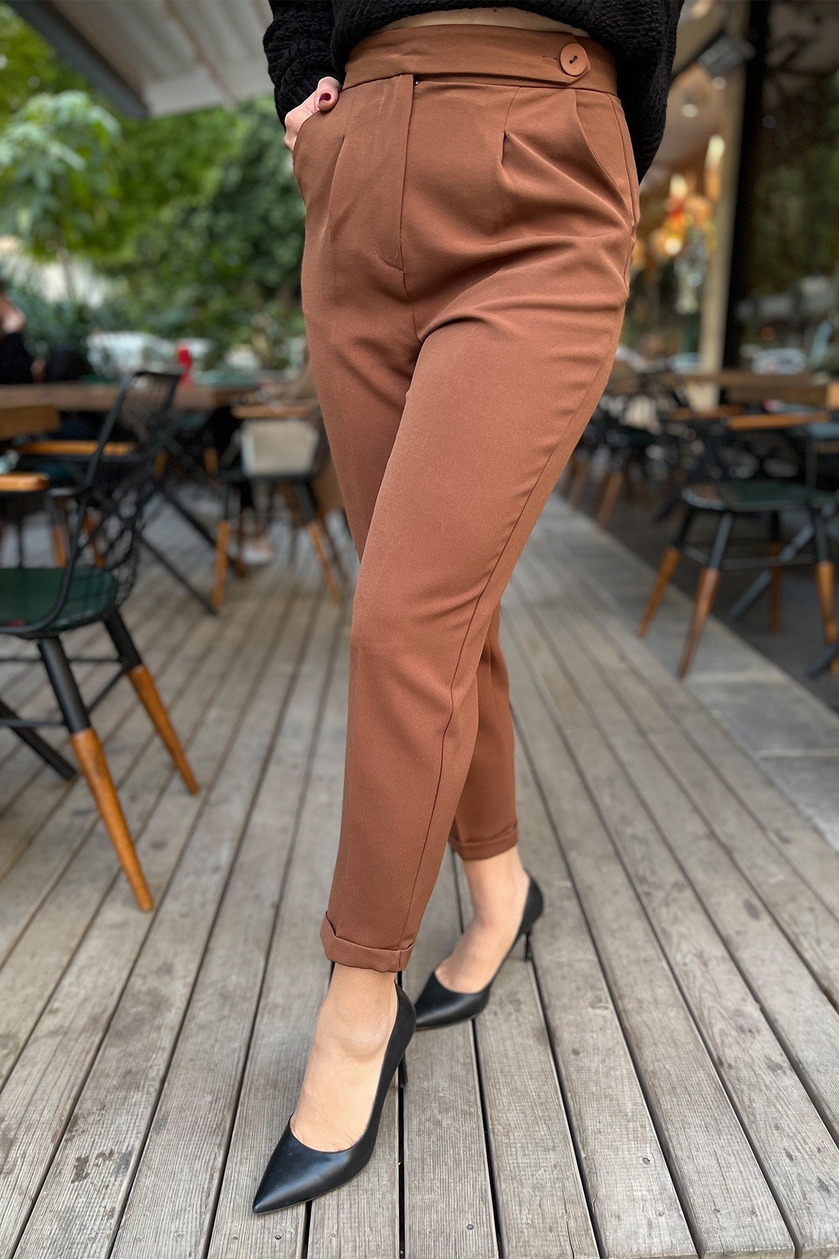 Kahve Renk Düğme Detaylı Kumaş Pantolon