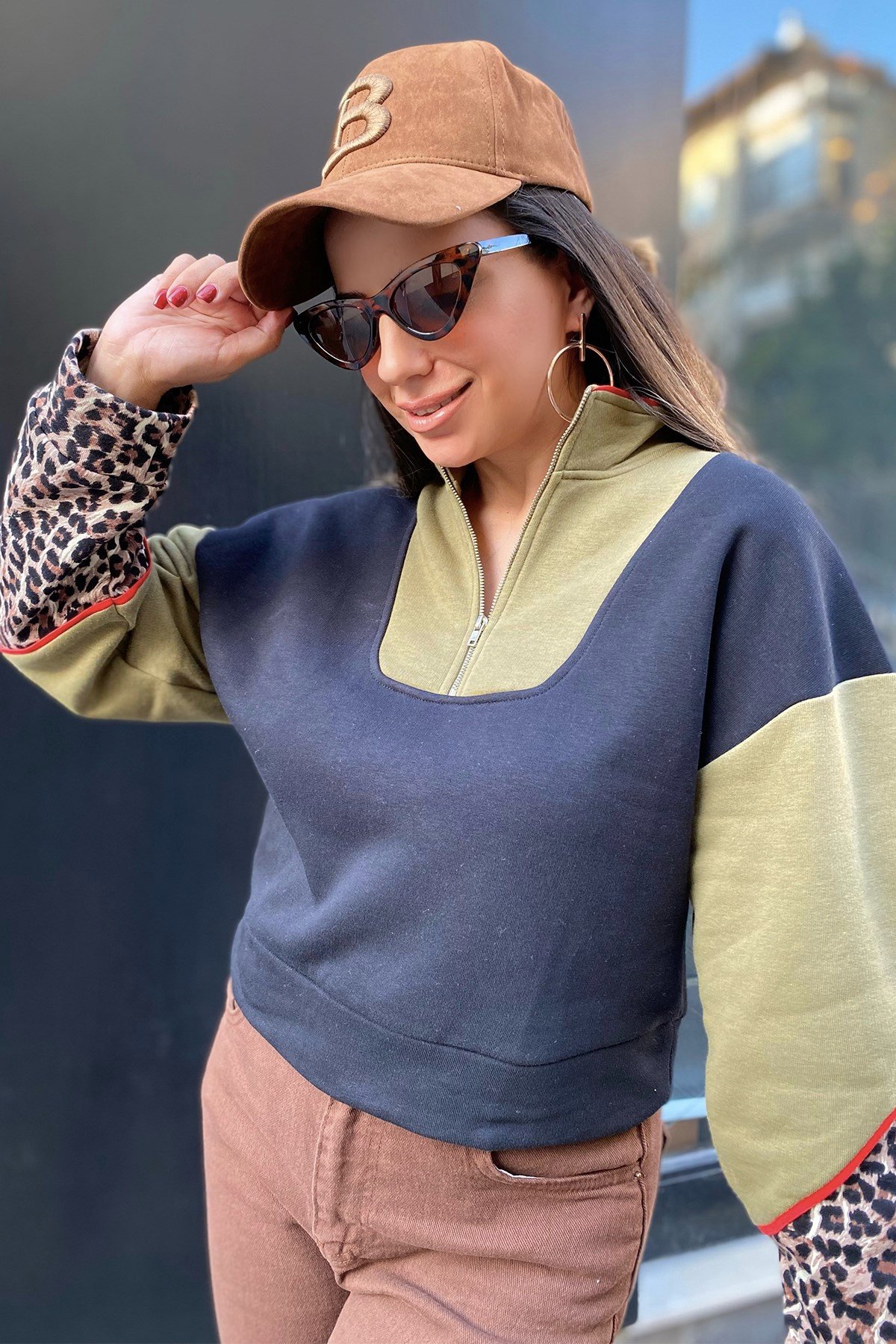Kolları Leopar Detaylı Önden Fermuarlı Sweat