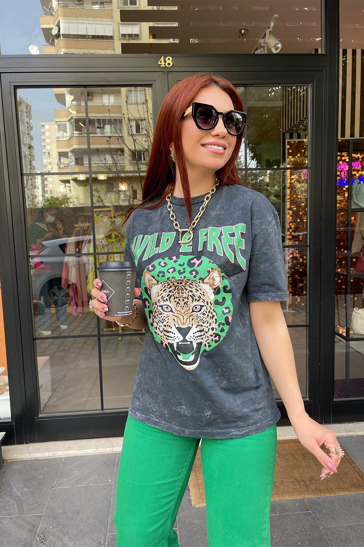 Önü Aslan Detaylı Yeşil Yıkamalı Tshirt