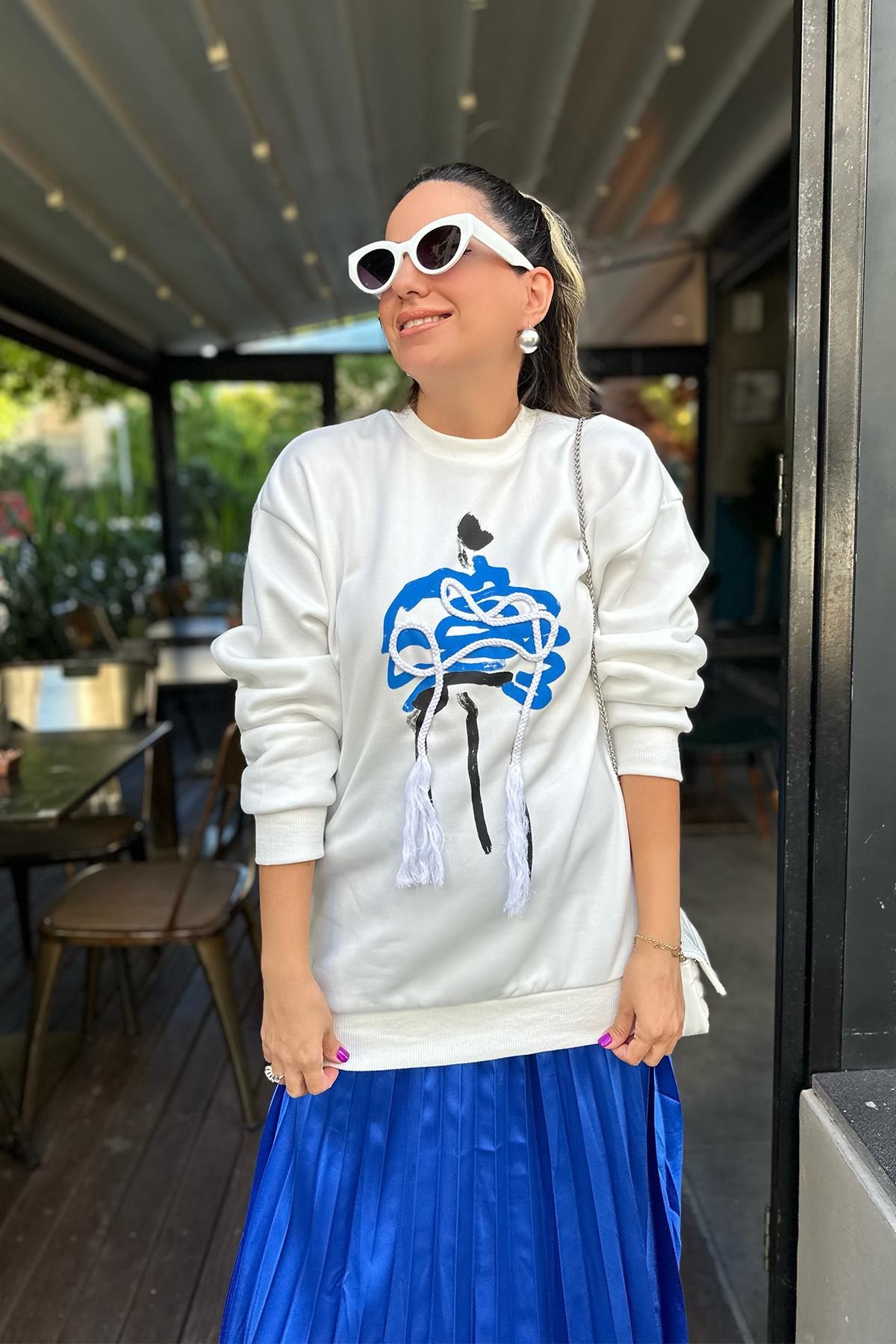 Önü İp Detaylı Beyaz Sweatshirt