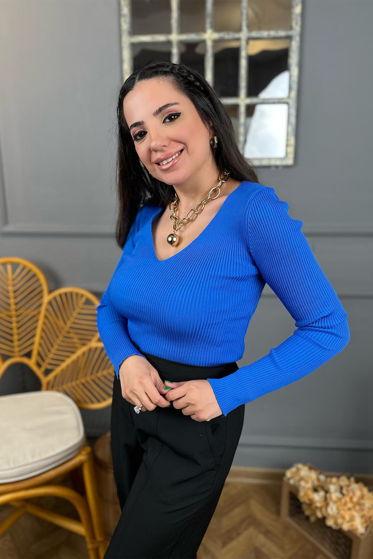 Saks Mavi V Yaka Fitilli Triko Bluz