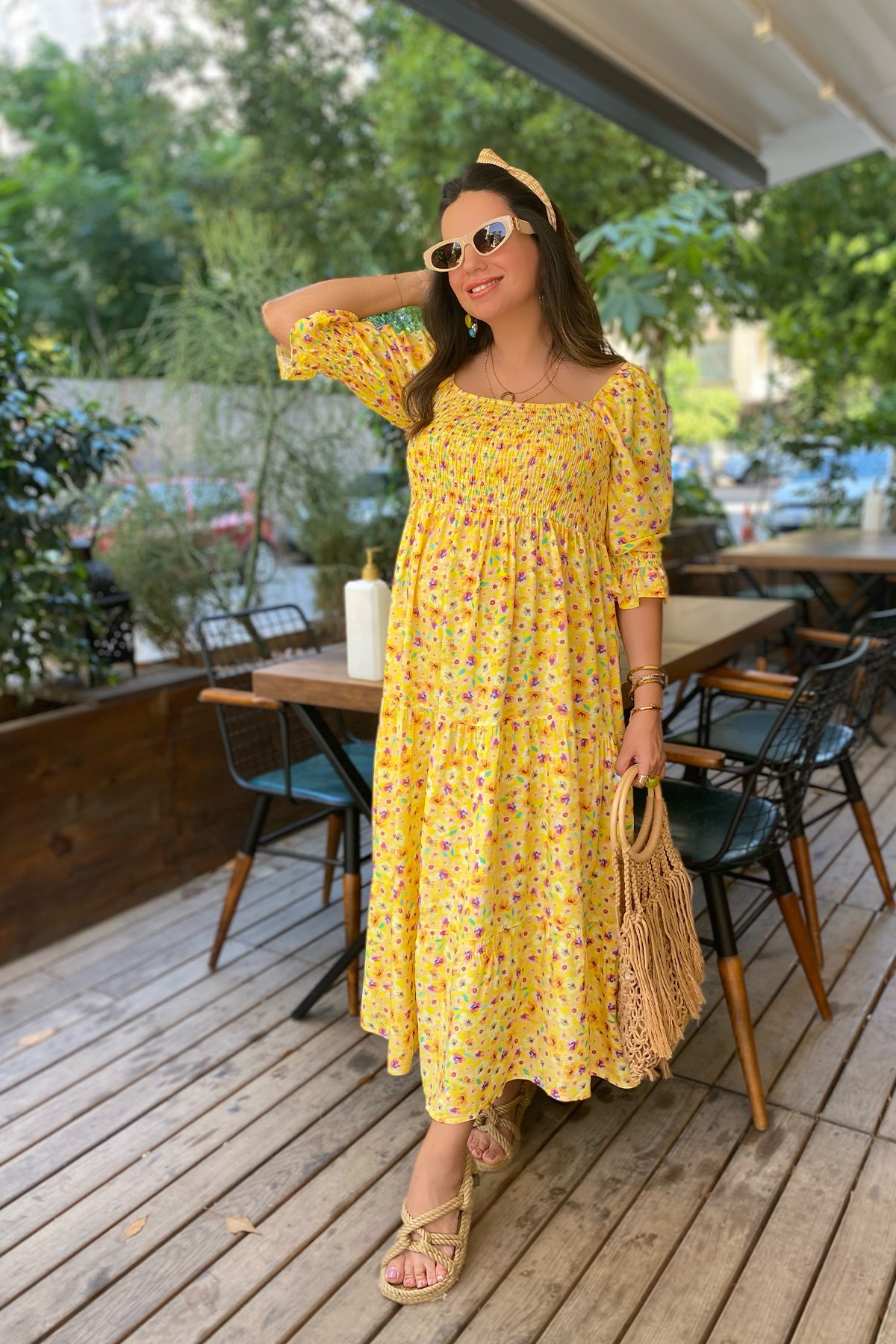 Sarı Desenli Önü Gipeli Viskon Elbise