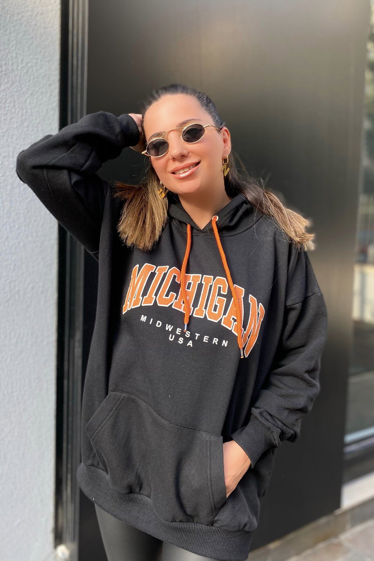 Siyah Michigan Baskılı Kapşonlu Sweatshirt