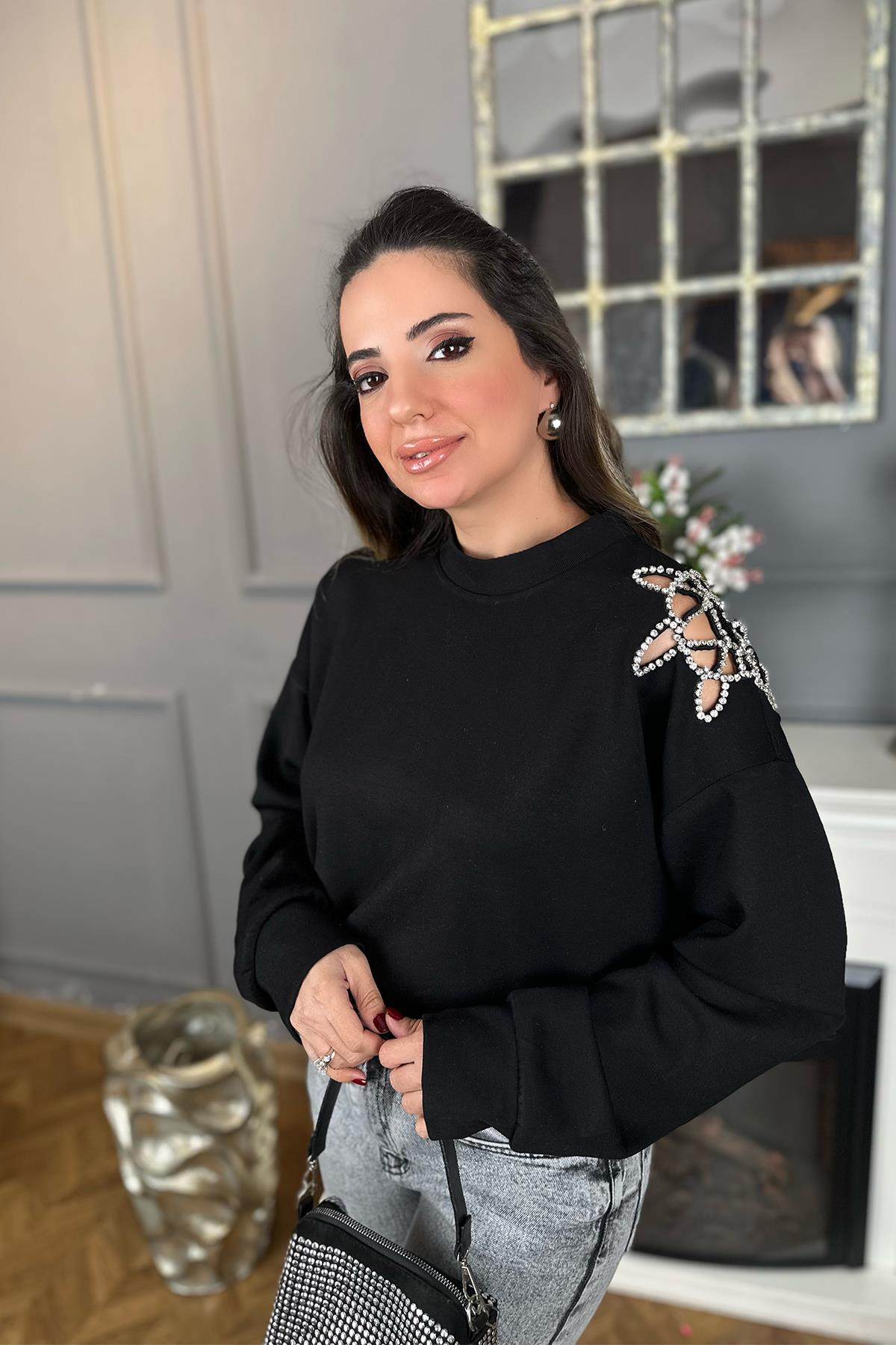 Siyah Omuz Taşlı Sweatshirt